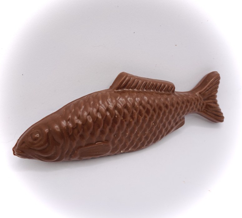 Ce poisson se décline au chocolat noir, lait et blanc et il est garni de fritures.